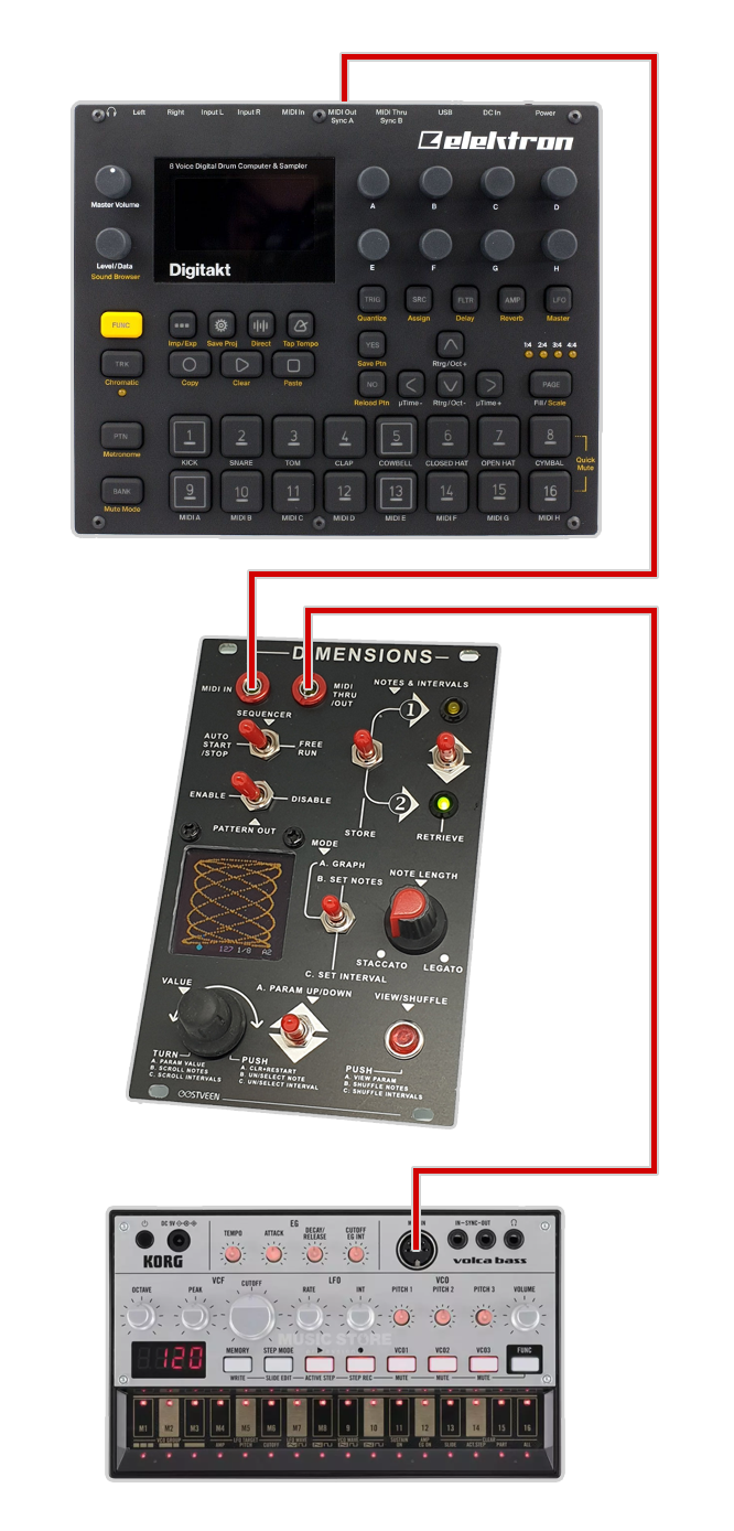 Important to understand is that, after power up, Dimensions will wait for a MIDI clock. In the above example, the MIDI clock is provided by the Elektron Digitakt but, of course, that can be any MIDI device or DAW for that matter.