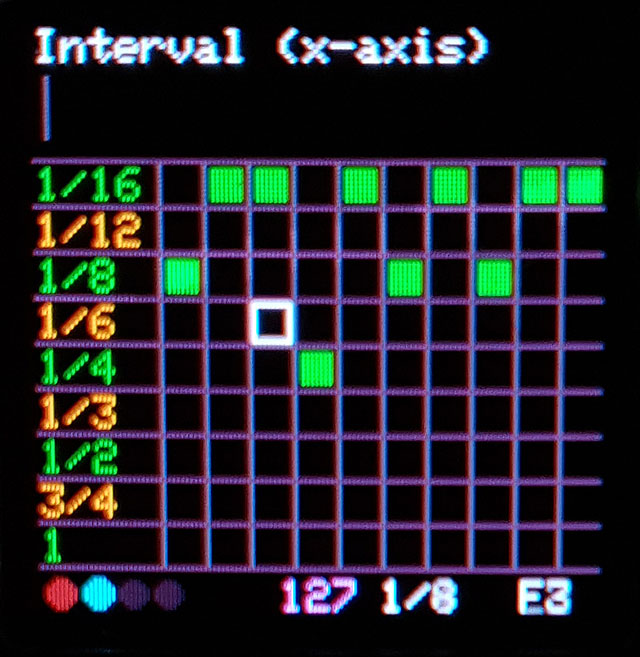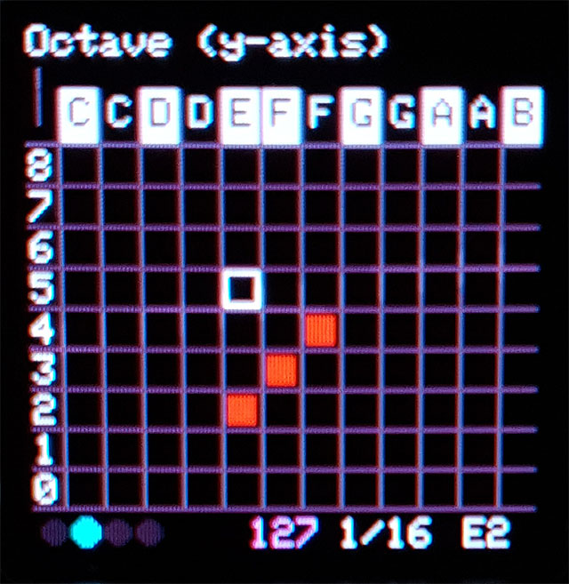 Values on the X-axis (left/right) represent note intervals (4th, 8th, 16th etc.). Values on the Y-axis (up/down) represent note numbers (A, B, C, C# etc.).