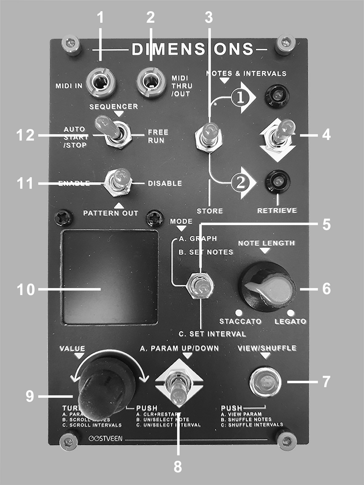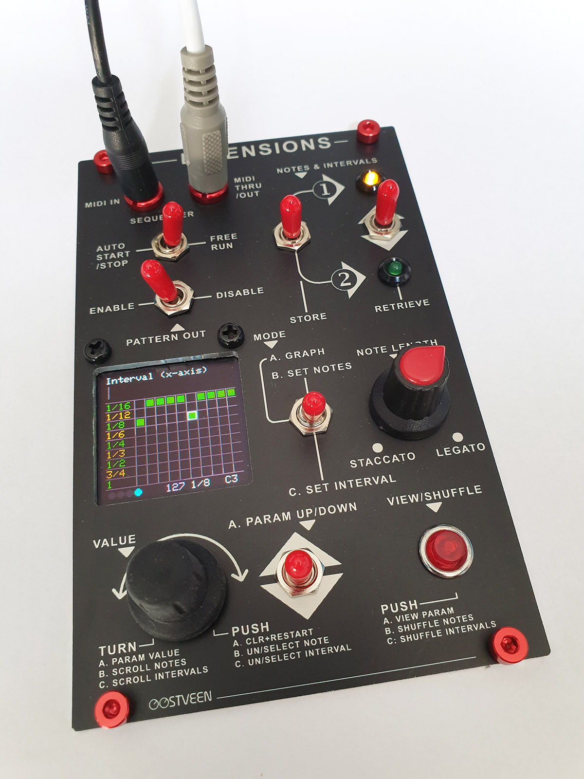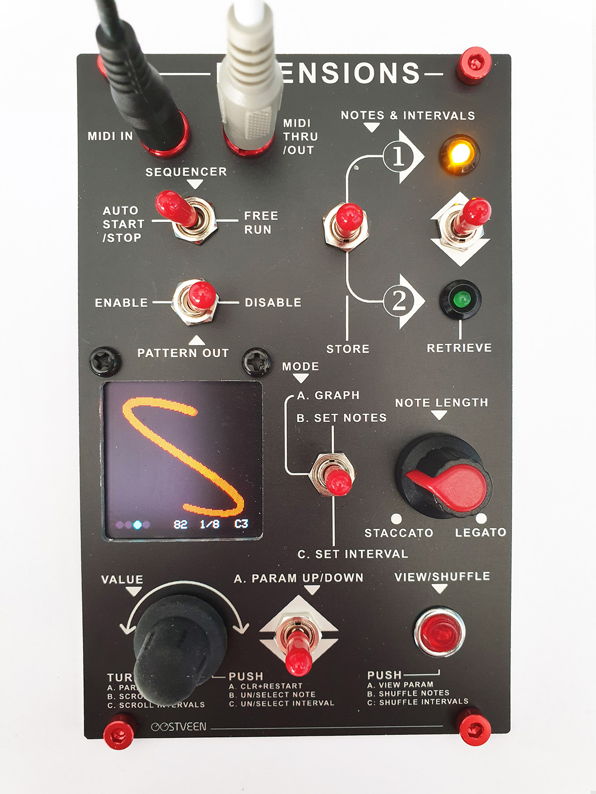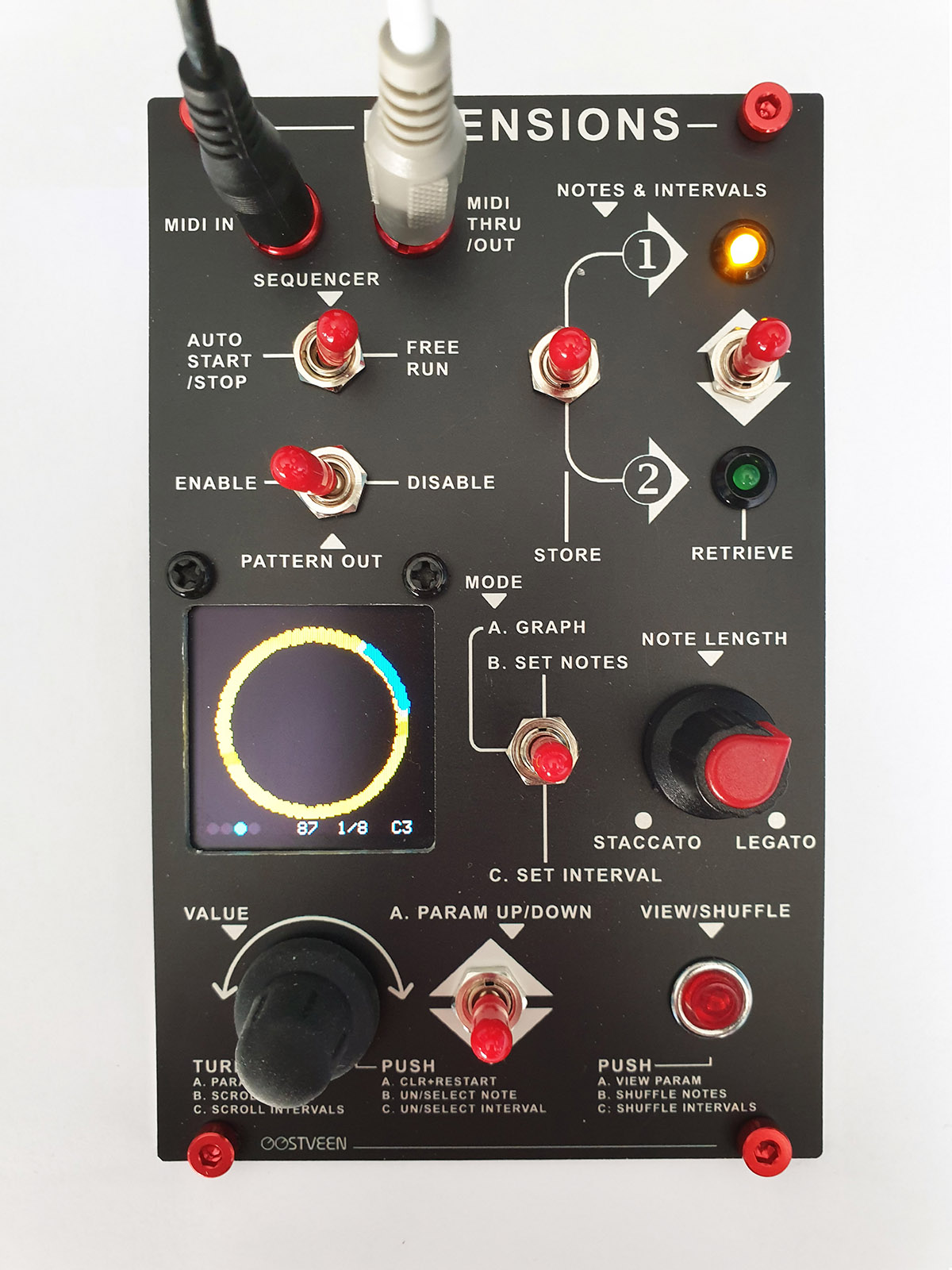 VIEW/SHUFFLE The function of the red push button depends on the set mode. In Mode A the current menu parameter is shown for a few seconds. In Mode B you can shuffle set notes. In Mode C you can shuffle set intervals.