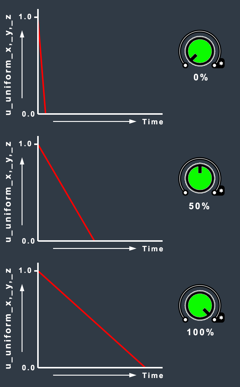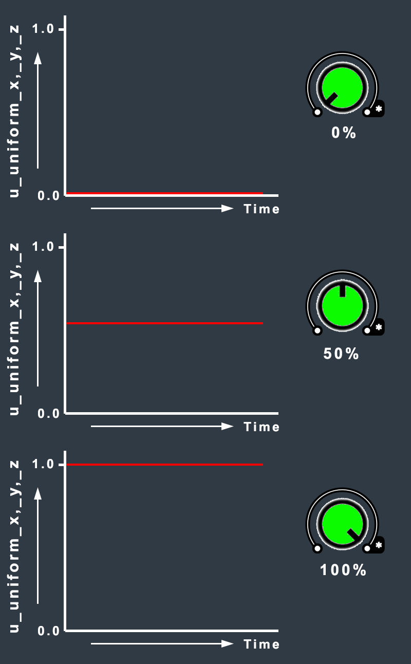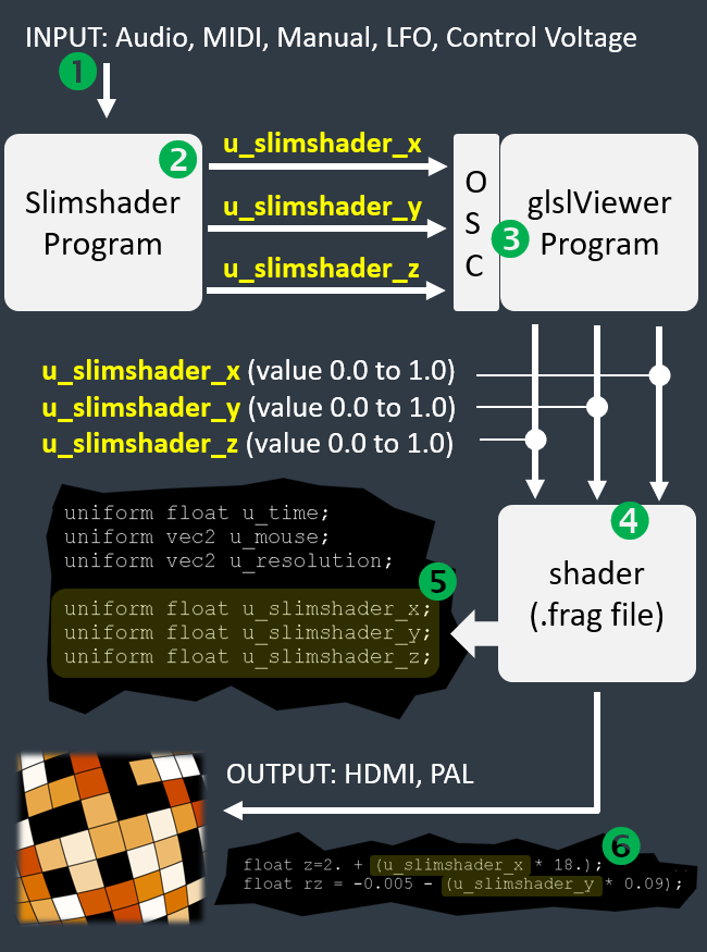 (5) Inside the shader file, which is just a plain editable text file, these passed-on variables are called "Uniforms". In order for the shader to "understand" these incoming 0.0 to 1.0 values, we define them as uniforms (i.e. "uniform float u_slimshader_x;" etc.).