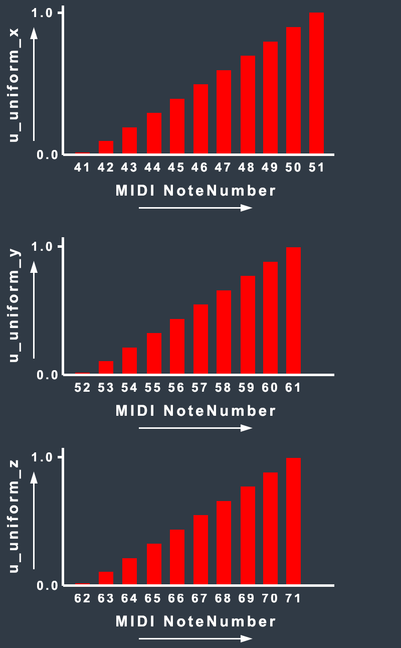 See video below (no sound); only three notes are used in Trigger mode: C, C# & D (MIDI Note Numbers 60, 61 and 62). C triggers the module's internal X value. C# the Y value and D the Z value. How fast each value drops for 1.0 to 0.0 depends on the setting of the X, Y and Z dails (0% = Fast, 100%, = slow). Look for the subsection "Mode 4t & Mode 4k (MIDI CH10)" to read more about trigger mode.