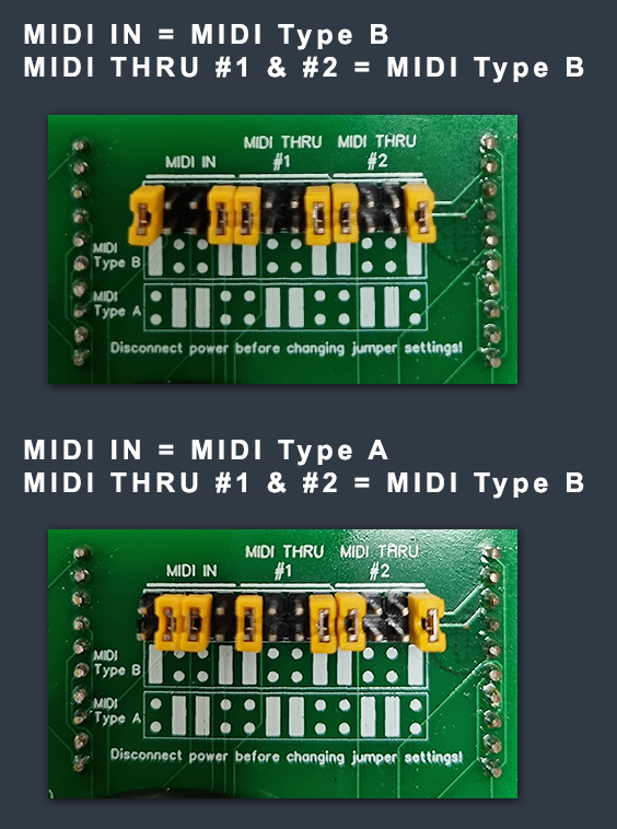 Below are two examples. Simply copy the PCB's printed diagram to switch between MIDI Type A or B. MIDI Types A and B are functionally identical; it's just that source/sink (i.e. Tip/Ring) are reversed. Please don't try any other combination as this may result in damaging your MIDI connection.