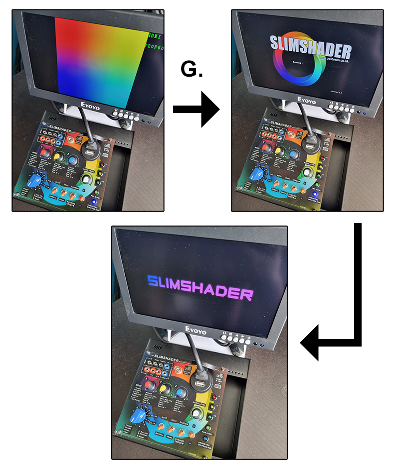 G. During the boot up you should see the standard Raspberry rainbow screen after which you should see the Slimshader splash screen - and finally the text "Slimshader", which is in fact a shader file.