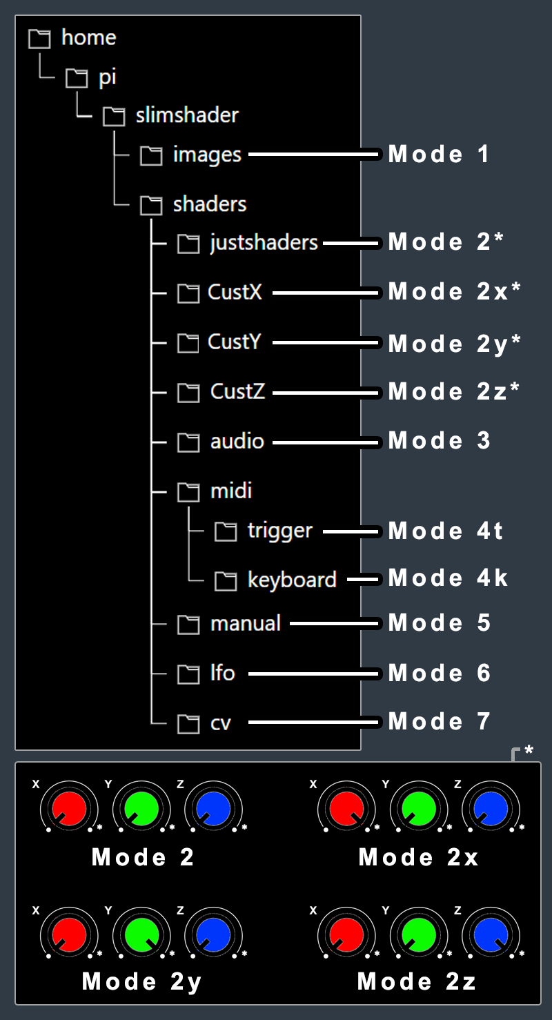 Before going through each mode, please have a look at the Raspberry PI's directory structure of the Slimshader module. The directories shown below are locations where you can find the images and shaders used for each of the 7 modes.