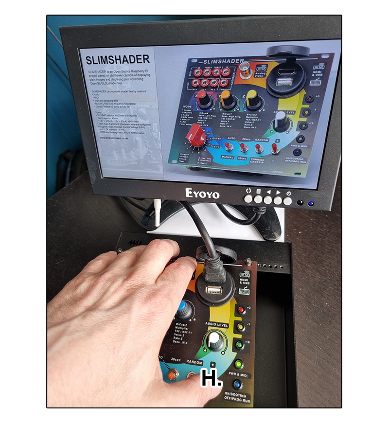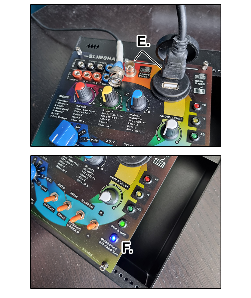 F. Switch on the power. The "ON/Booting", "OFF/PROG RUN" Blue LED should light up. When the LED turns off, the main Slimshader program has succesfully started.