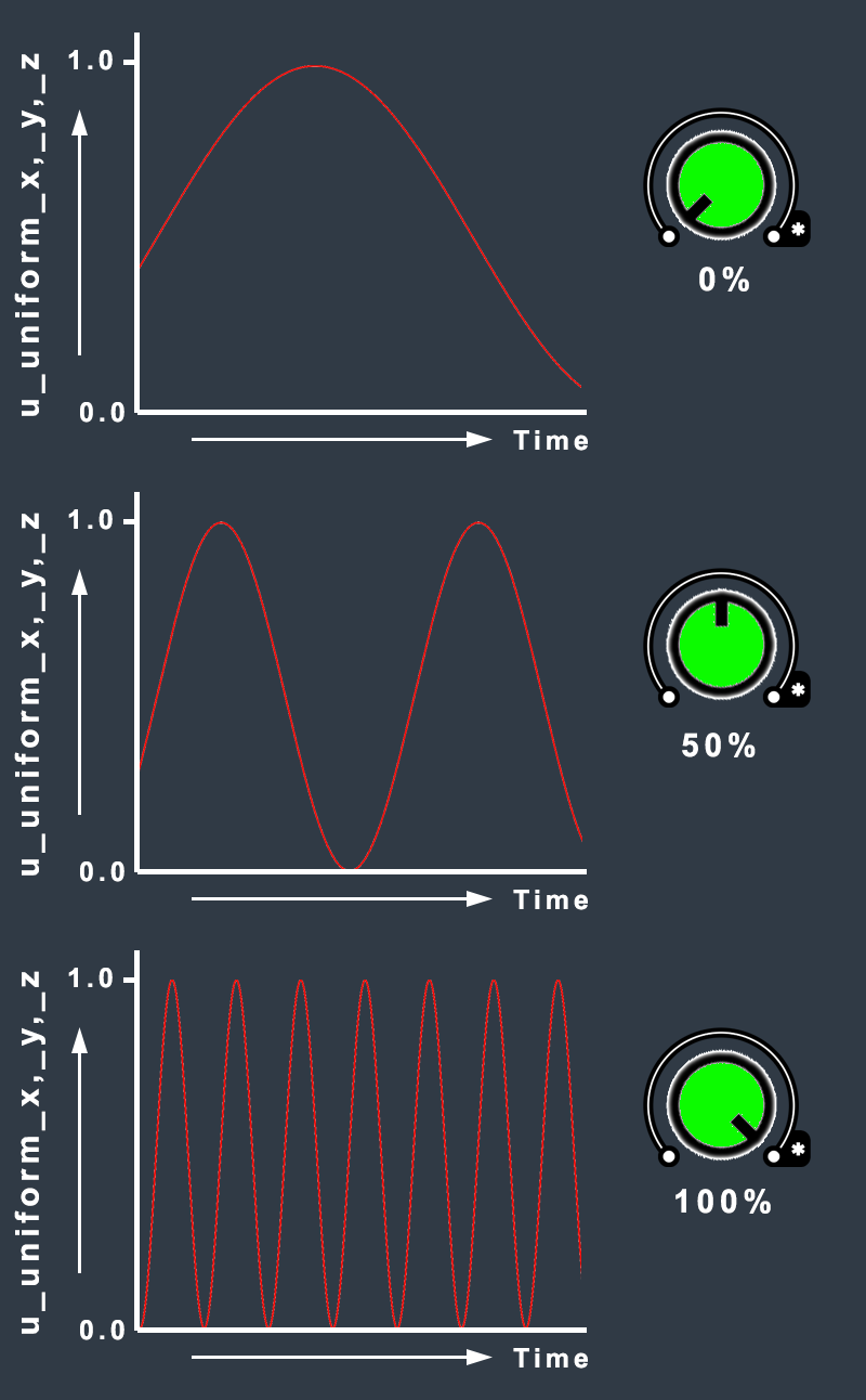 (6) we can now add these uniforms throughout the shader file code and influence/control/modulate various aspects of what the shader file is showing on screen like motion, colour, size, brightness etc. - the sky is the limit!