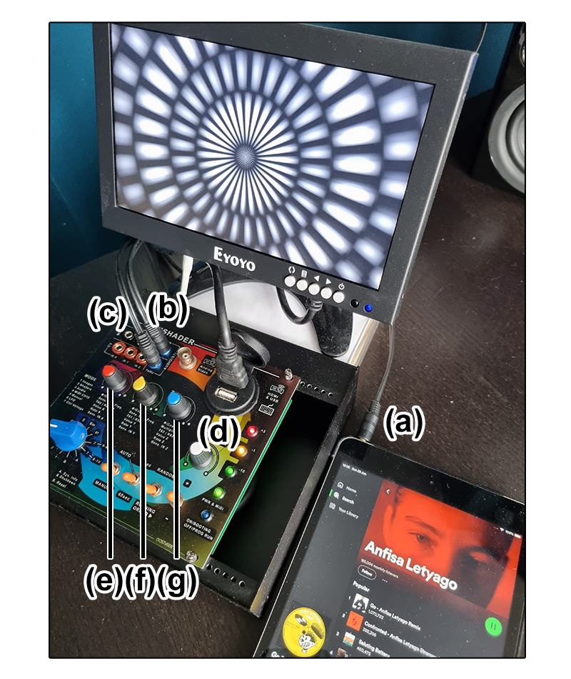 Switch to MODE 3. In this mode, shaders will react to incoming audio. See below; (a) connect the line- or headphones output of a stereo device to (b) the audio input of the Slimshader module. (c) connect the stereo output, which is simply the same audio signal that goes into the module, to an amplifier or mixing console. Set dail (d) as such that the three LEDs (Green, Amber and Red) light up with Red flashing occasionally when the audio peaks. Essentially here we are aiming for a nice incoming audio level (not too low and not constantly too high). Dail (e) sets the sensitivity to bass sounds and dail (f) sets the sensitivity to high pichted sounds. Dail (g) boosts the module's internal X- and Y- values coming from dails (e) and (f) - this way you can get some extreme -over the top- looking visuals.