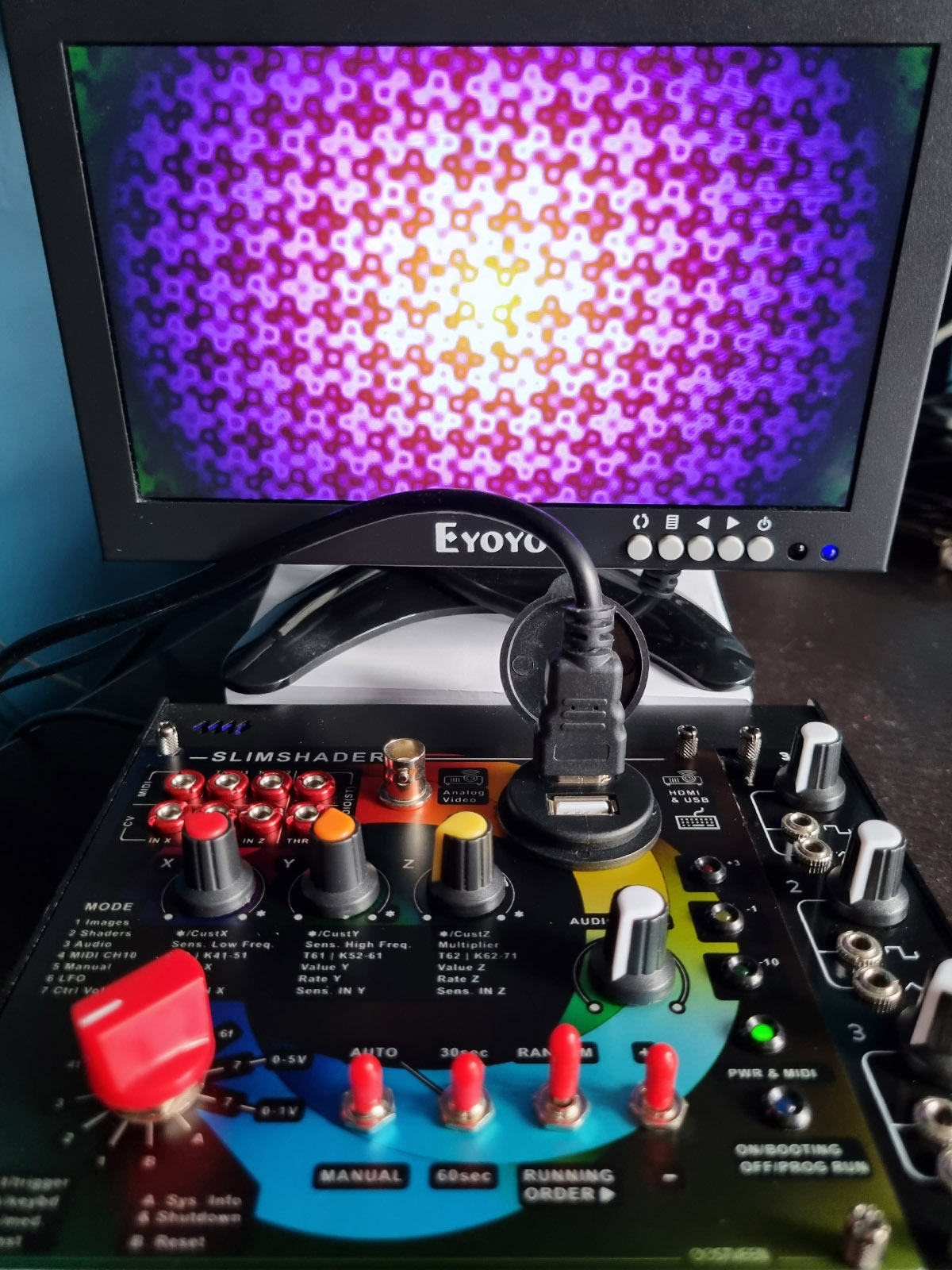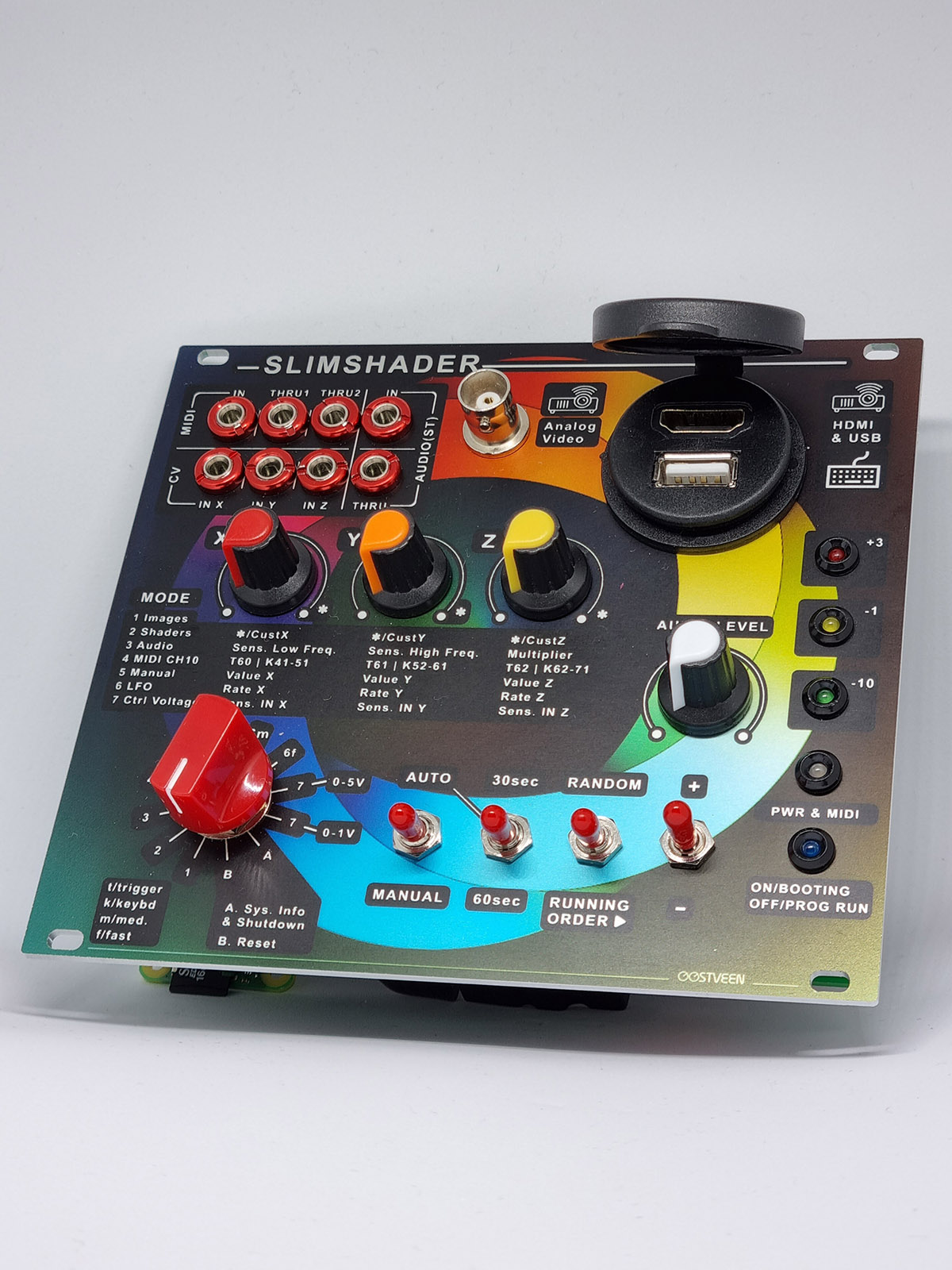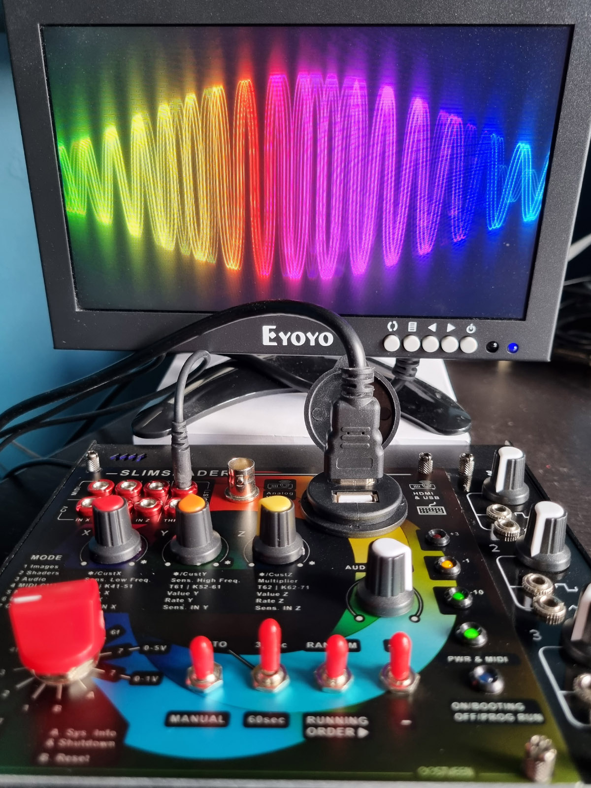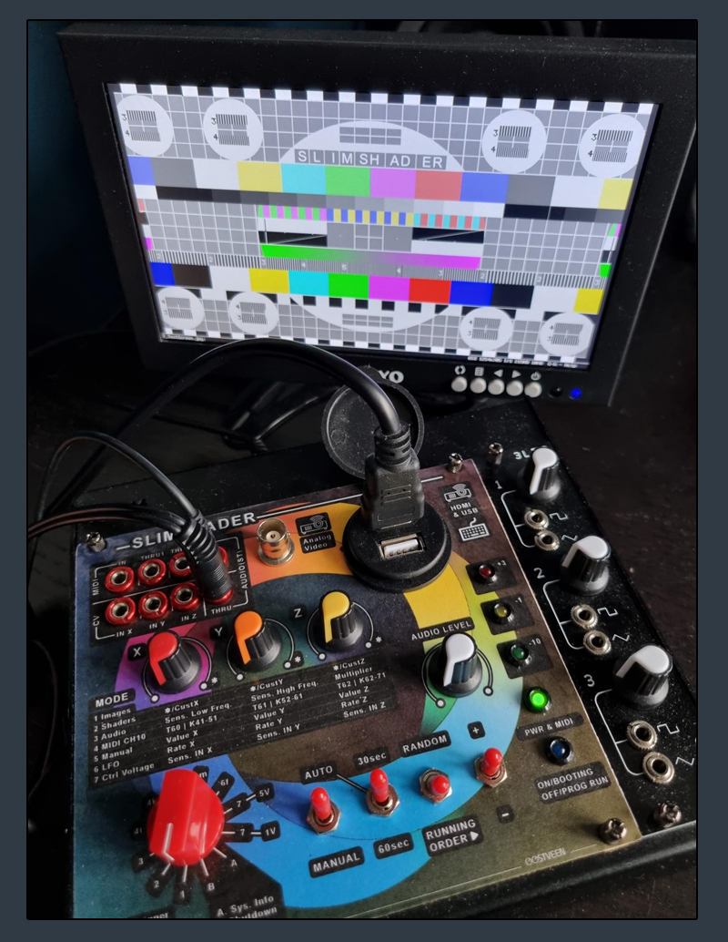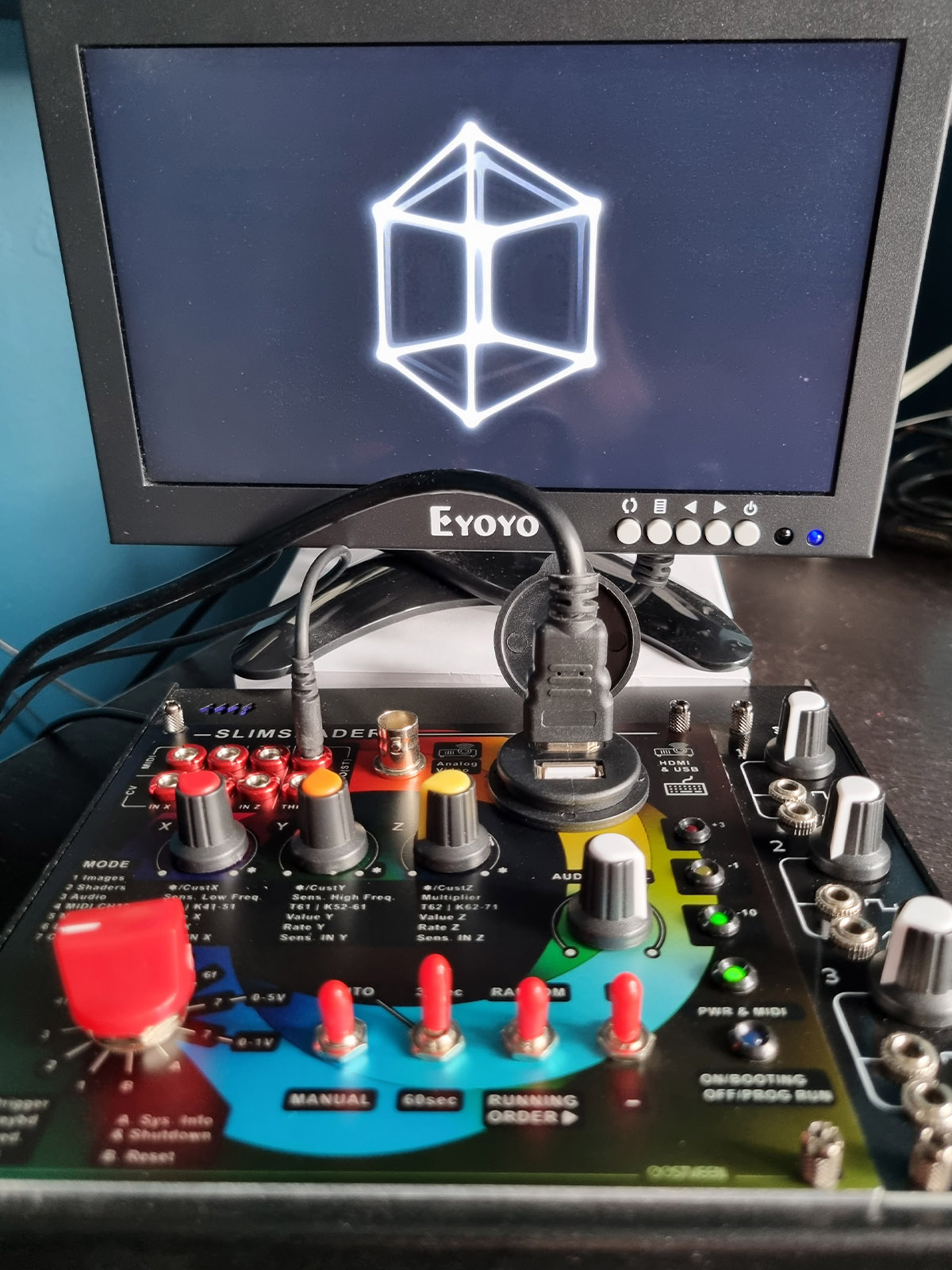 SLIMSHADER is a Eurorack format design with HDMI and Analog video output for people who like to add visuals to their music, for video-synth enthusiasts or anyone looking to learn and play with shaders files.