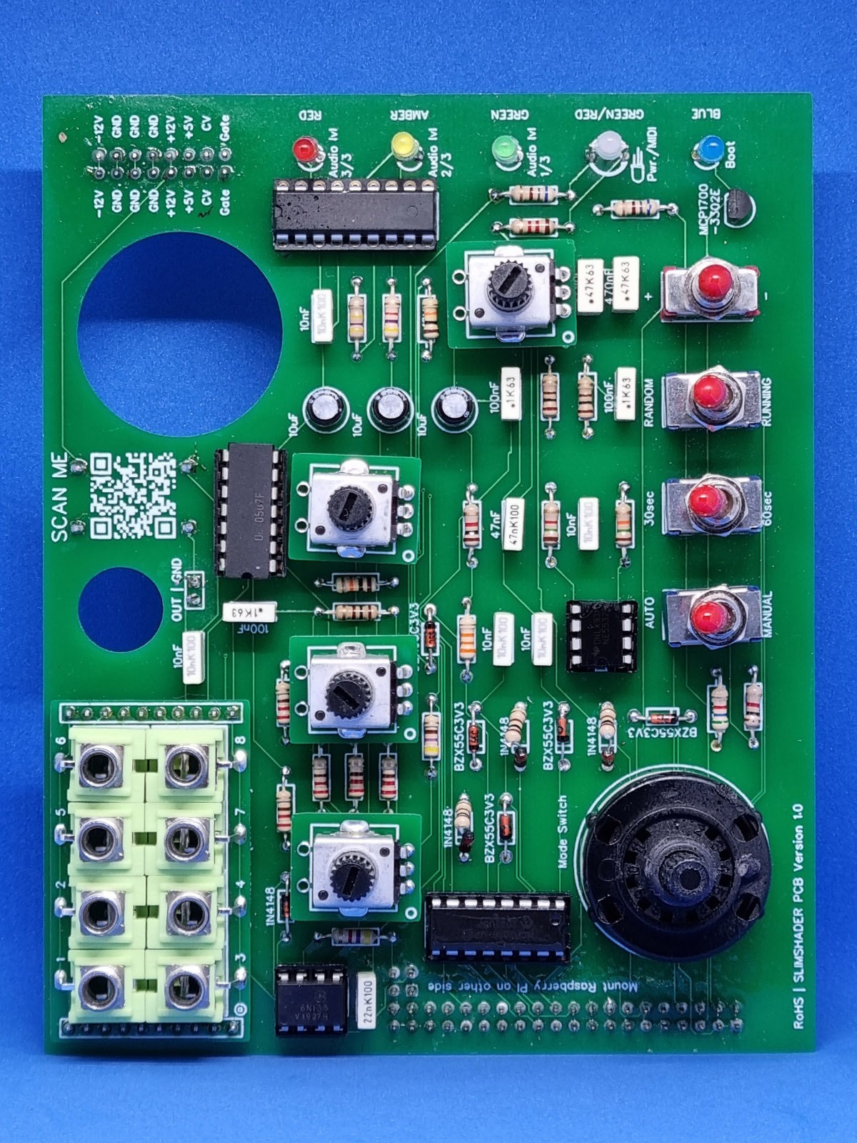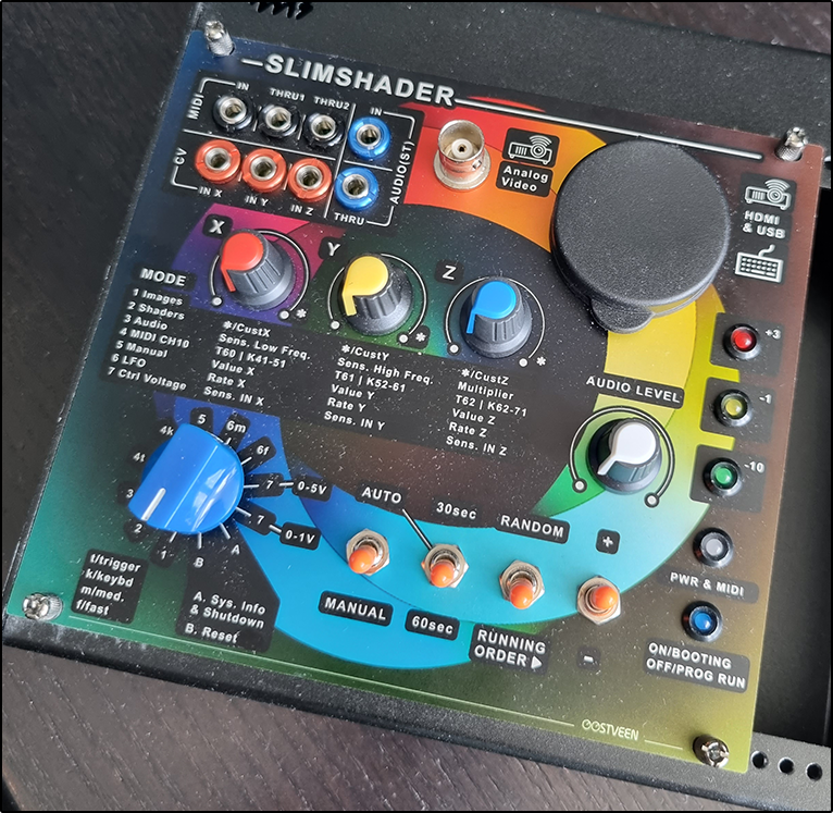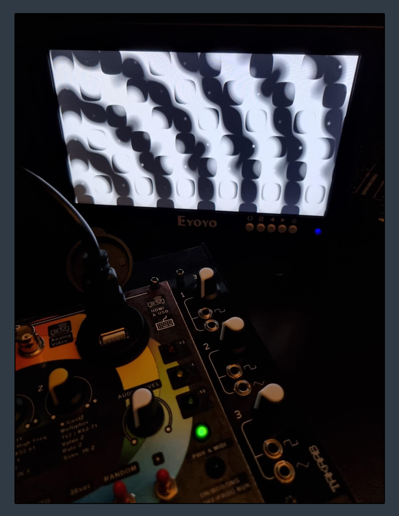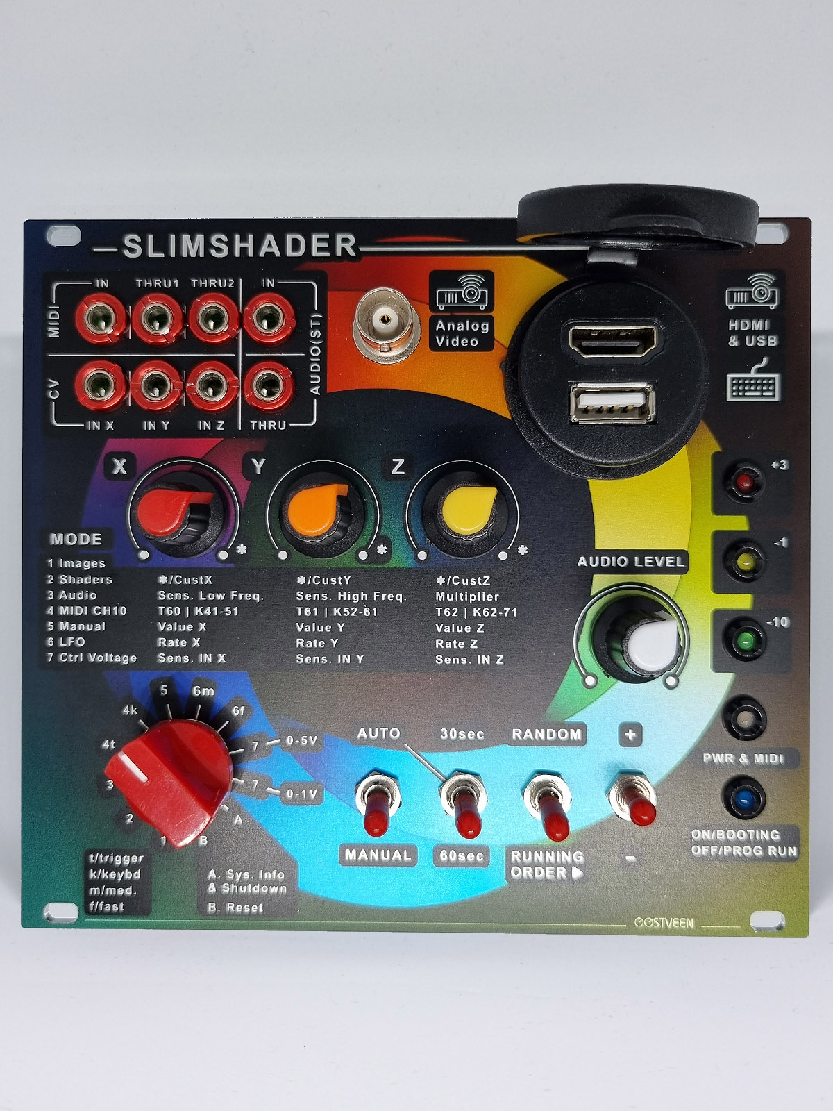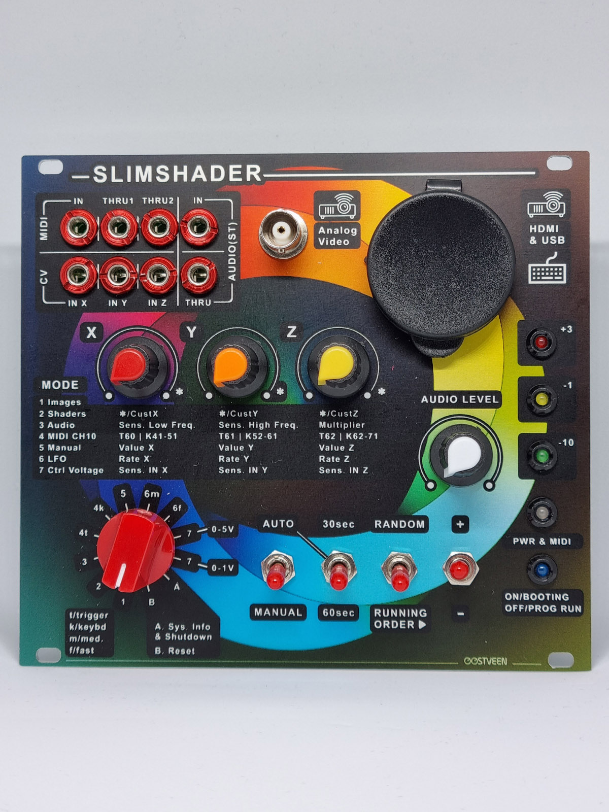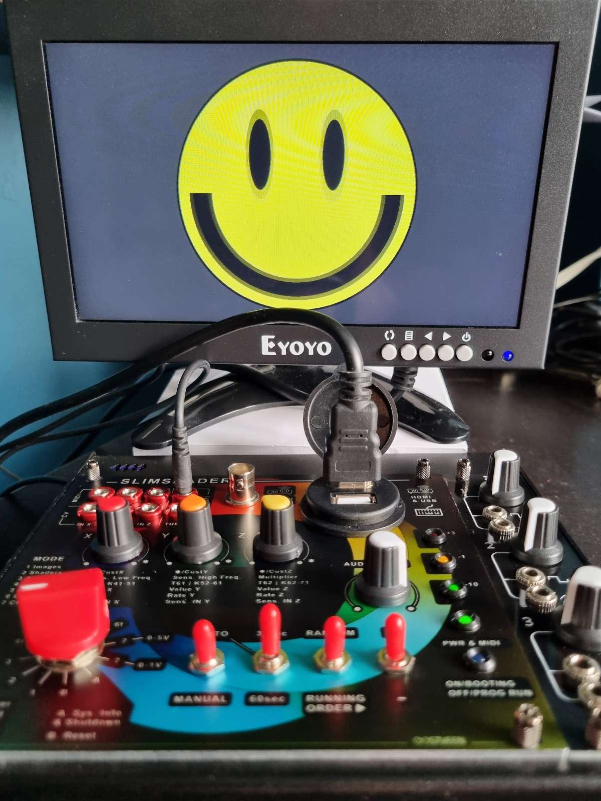 SLIMSHADER is a Eurorack format design with HDMI and Analog video output for people who like to add visuals to their music, for video-synth enthusiasts or anyone looking to learn and play with shaders files.