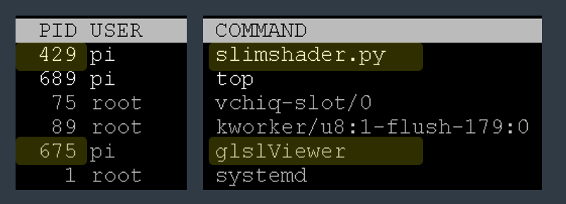 Before you do all this, you may want to kill and Slimshader processes - see section Navigating Slimshader. PS: as you become more familiar with the workings of the Raspbian Operating System, you'll find various other -better & faster- ways of modifying shaders. This manual sets out to be consistent in doing things - in perhaps not always the most efficient way.