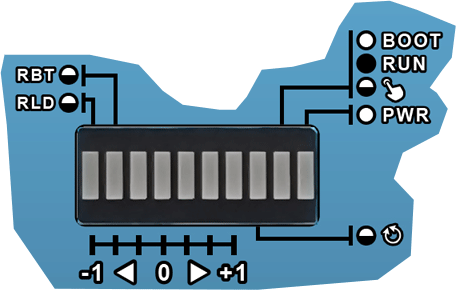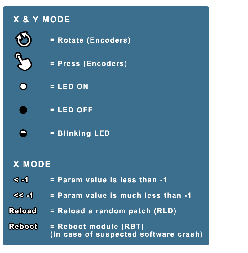 ▪ ▪ Go way below -1 (depicted as "<<-1") and LED "RBT" (2nd LED) starts blinking fast indicating that if you press the encoder now, it will do a full Reboot (can take a few minutes). This option is included in case, for whatever reason, the Raspberry PI crashes. It is rare for this to happen, but it's nice to have a reboot option instead of having to power down/up your whole Eurorack setup(!).