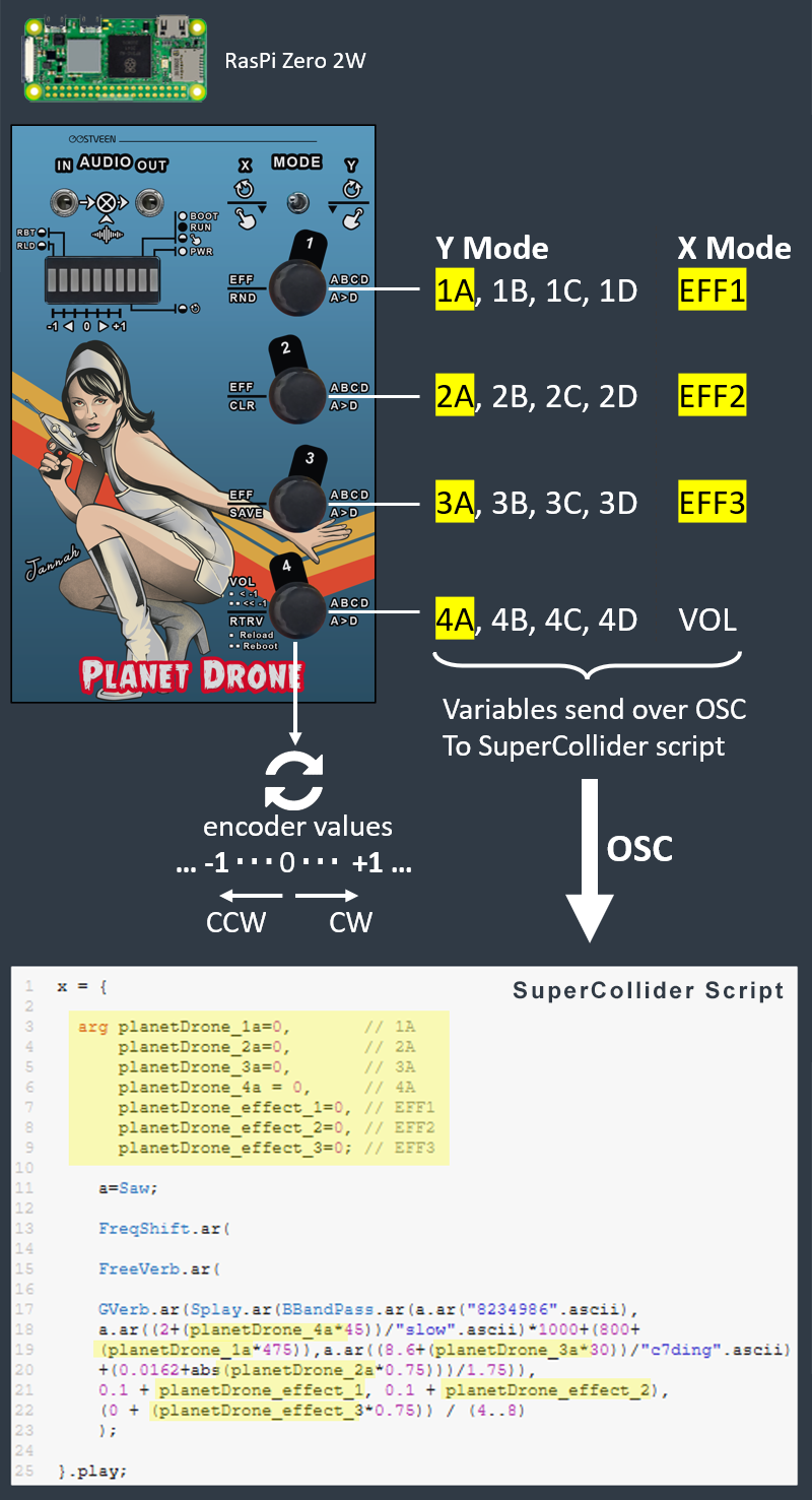 Everytime you turn an encoder, the Python main program broadcasts new values for any of the given Parameters over OSC and SuperCollider then applies these new values to the Patch that is running, which results in a change of pitch, effect (reverb etc.), filter settings or anything else that SuperCollider can change in realtime; it's a long list of what is referred to as Classes.