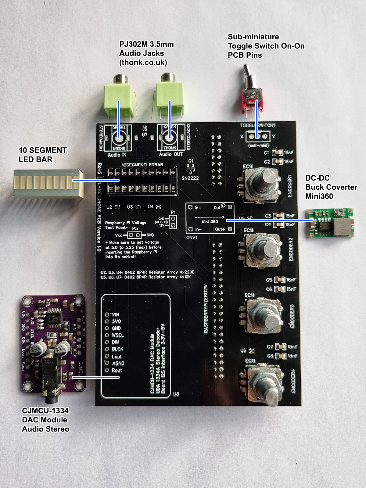 A3: Well, it was initially designed for the Raspberry PI Zero W but then the Zero 2W was released and I decided to continue the development with the Zero 2W as it has much better performance. In practical terms, the PCB’s 40 pin socket seats only the Zero W and Zero 2W – in addition, the design assumes an external audio board, which is already present on the larger Raspberry PI boards … so you’d have to do some config tweaking to make things work – but keep in mind that these larger boards don’t properly sit on the PCB’s 40pin connector.