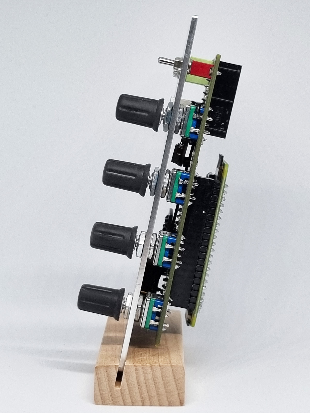 Installed on the Raspberry PI are SuperCollider, the realtime audio engine and Python, which monitors/controls the encoders, switches and LEDs.